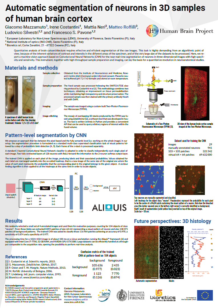 Quantitative analysis of brain cytoarchitecture requires effective and efficient segmentation of the raw images. This task is highly demanding from an algorithmic point of view, because of the inherent variations of contrast and intensity in the different areas of the specimen, and of the very large size of the datasets to be processed. Here, we report a machine vision approach based on Convolutional Neural Networks (CNN) for the near real-time segmentation of neurons in three-dimensional images with high specificity and sensitivity. This instrument, together with high-throughput sample preparation and imaging, can lay the basis for a quantitative revolution in neuroanatomical studies.